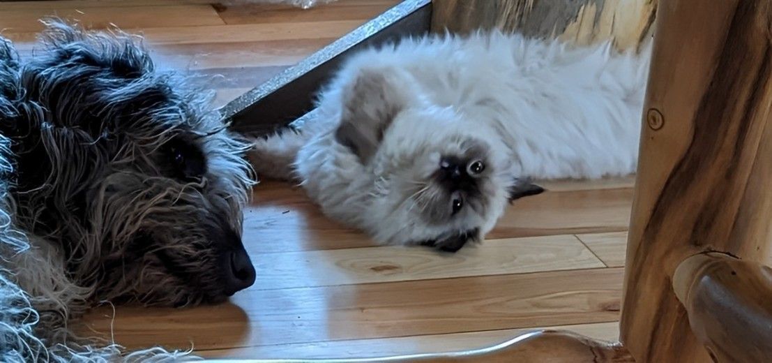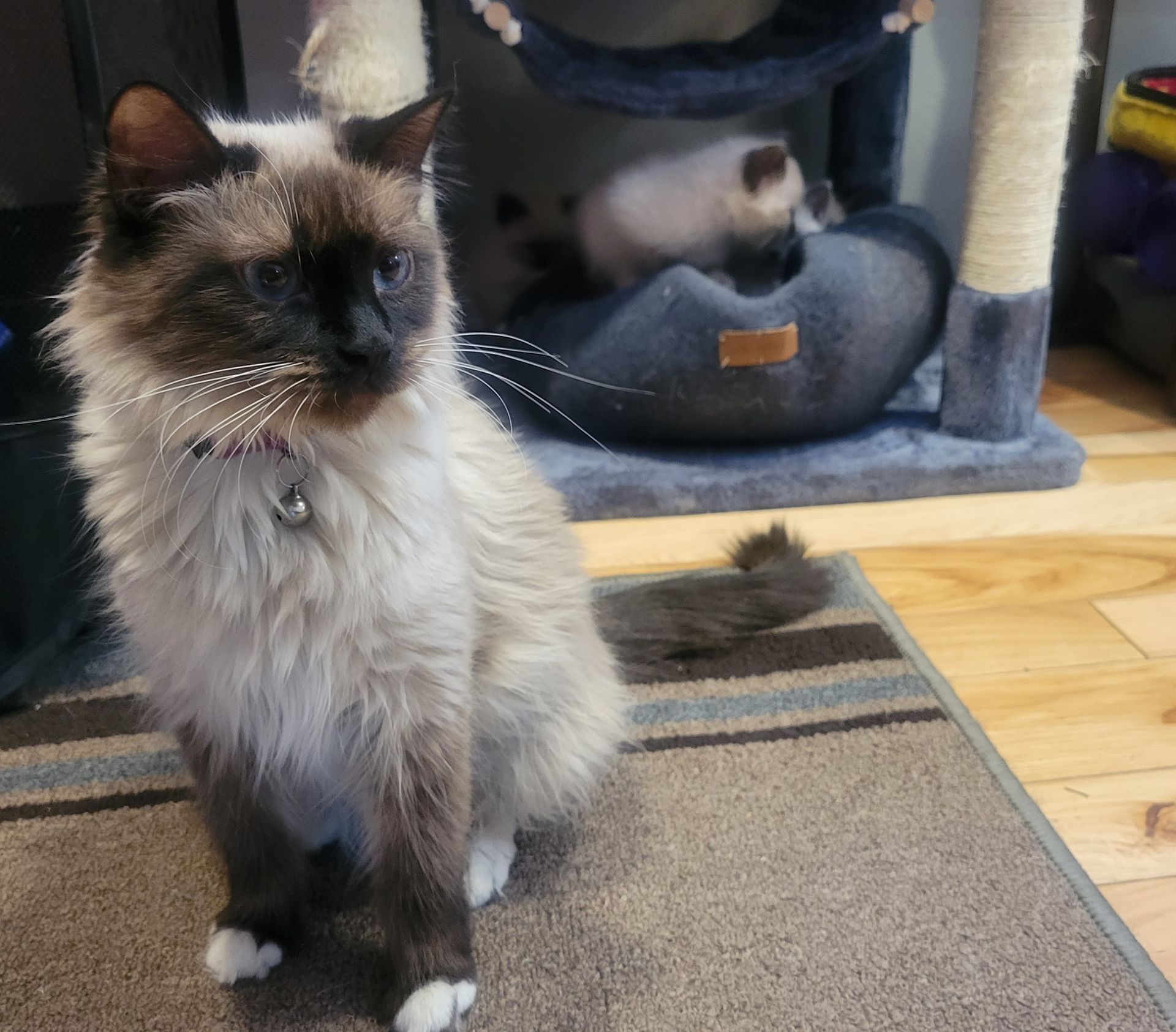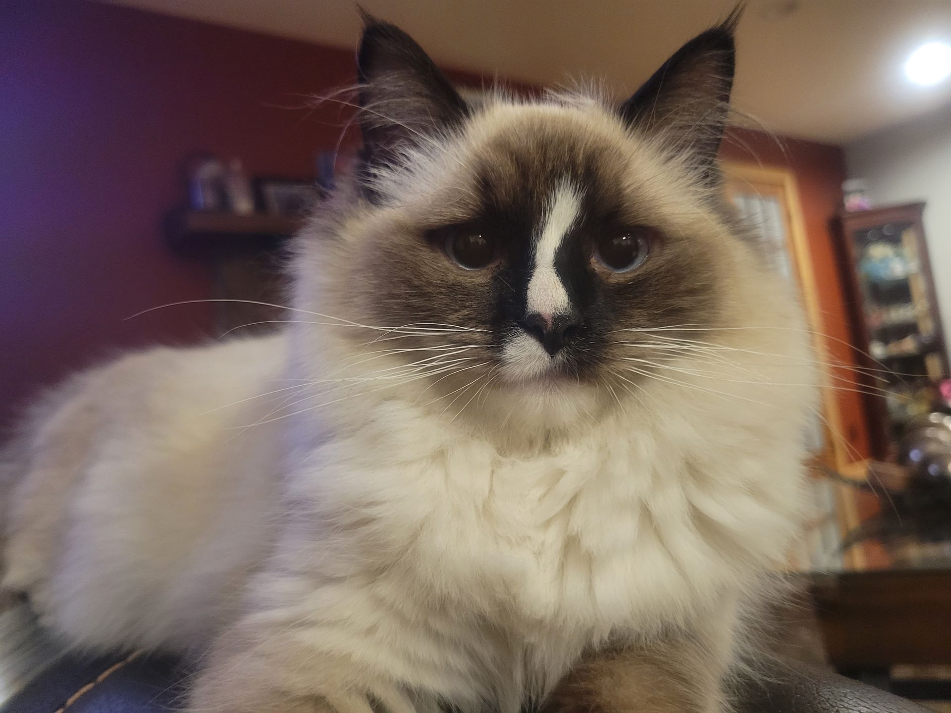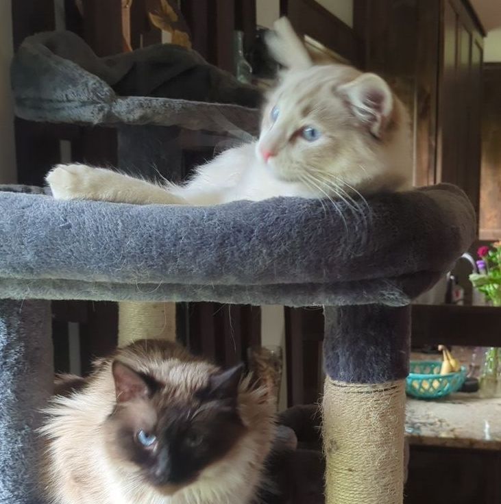 Bellini is a chocolate mitted Ragdoll with a Blaze on her forehead and nose. She is super soft and fluffy, likes to explore the house and wants our dogs to be her best friends. She demands attention and will let you know when you're not doing your job. She weighs 7.5 lbs
