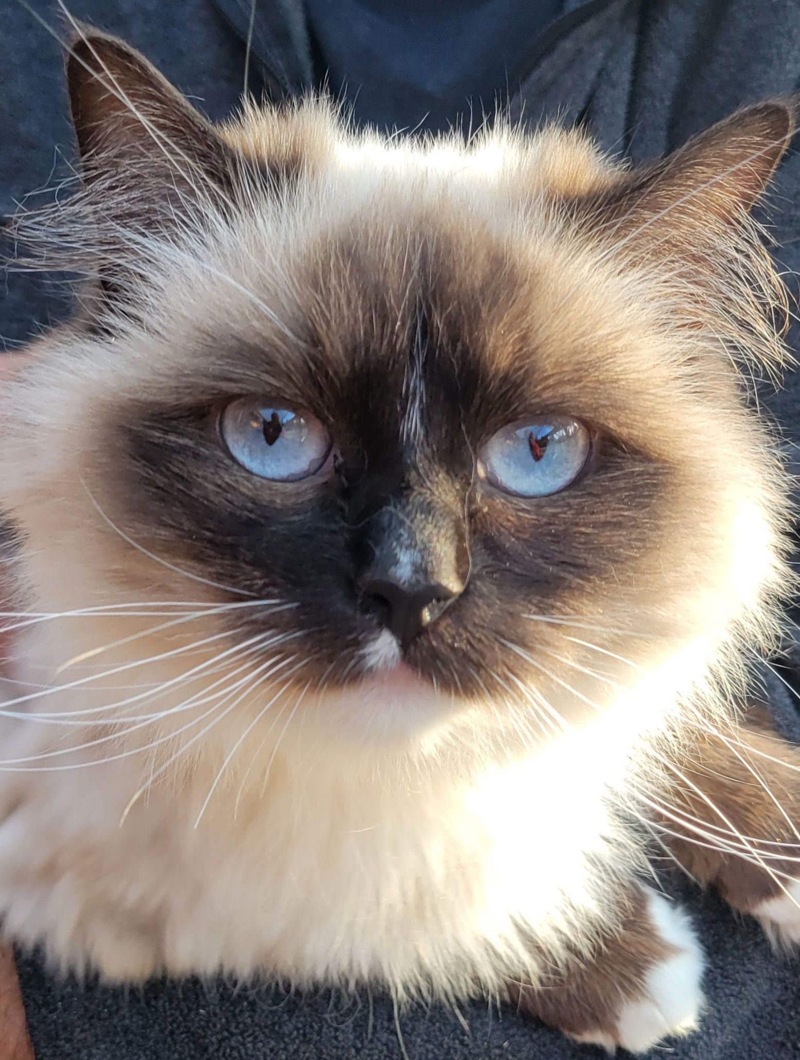 London is our super sweet chocolate point mitted Ragdoll. She loves to welcome you at the door, sleep in her hammock all day, or on our bed. She likes to tell us how her day is going. She weighs 8lbs